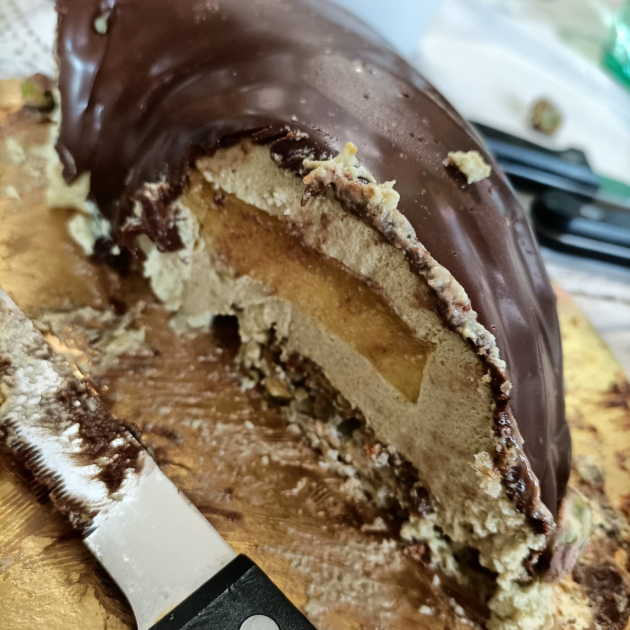 Innanzitutto vi spiego la torta. È una bavarese al pistacchio con un inserto di gelè al mango, un biscotto di meringa e pistacchio, uno strato croccante di corn flakes, pistacchio e cioccolato bianco il tutto ricoperto con una glassa al cioccolato fondente.